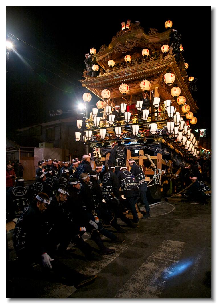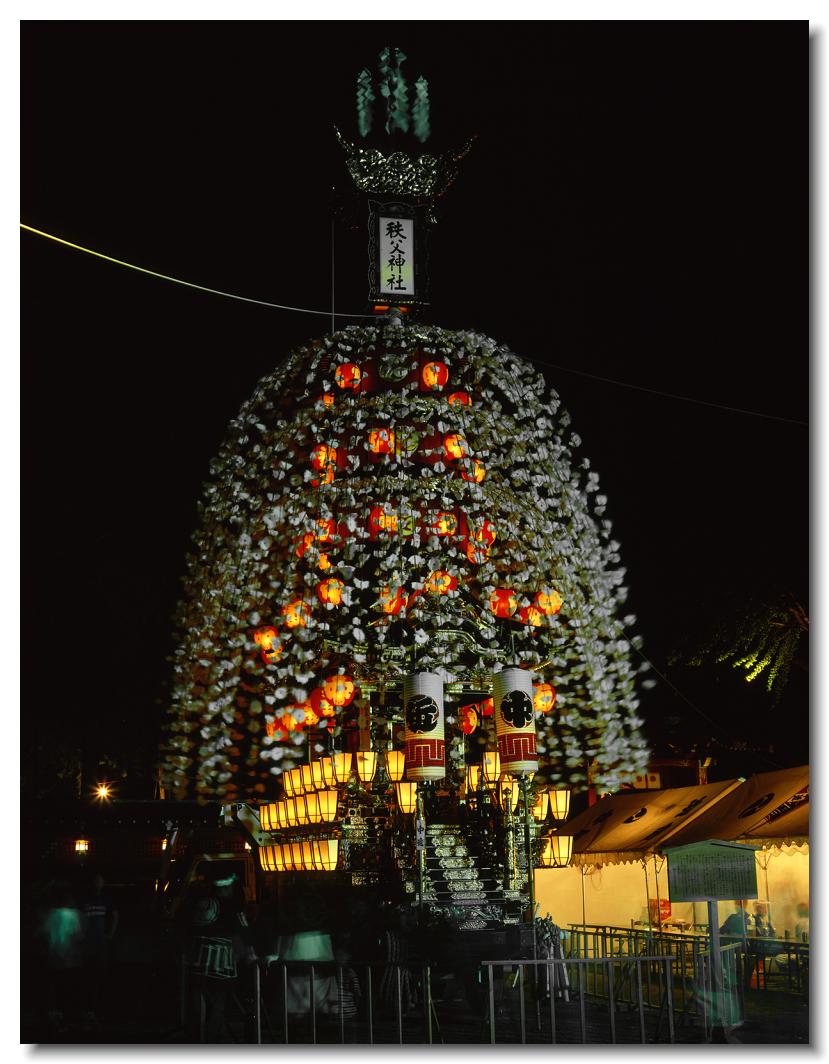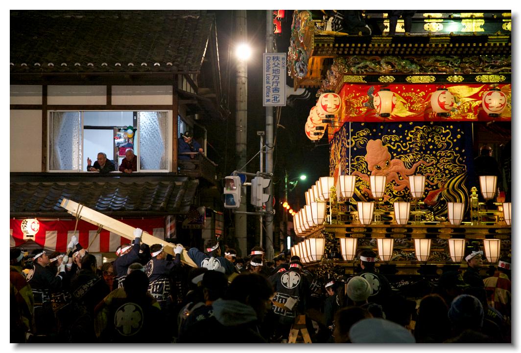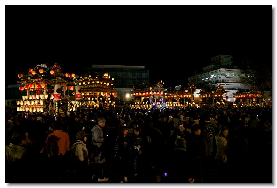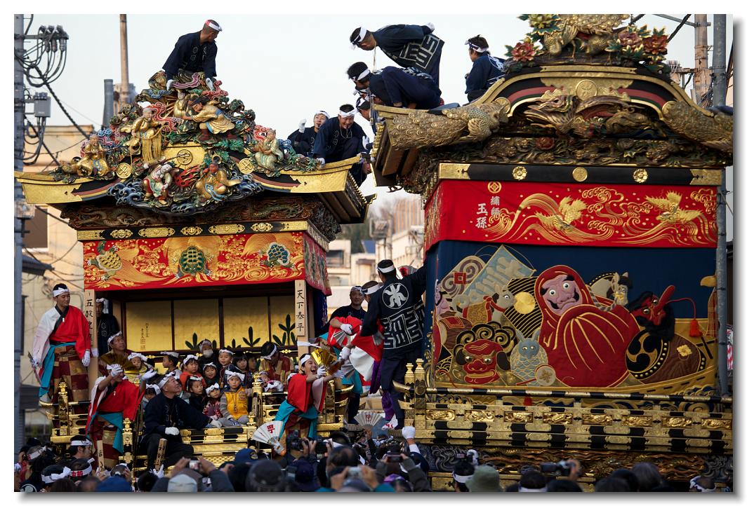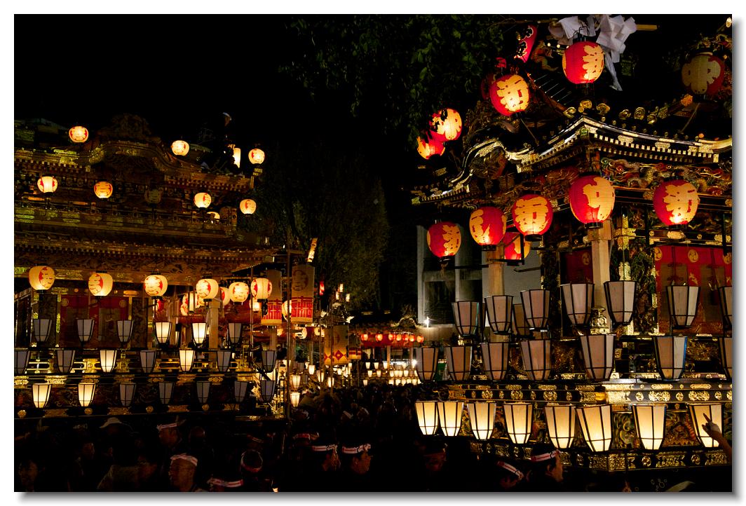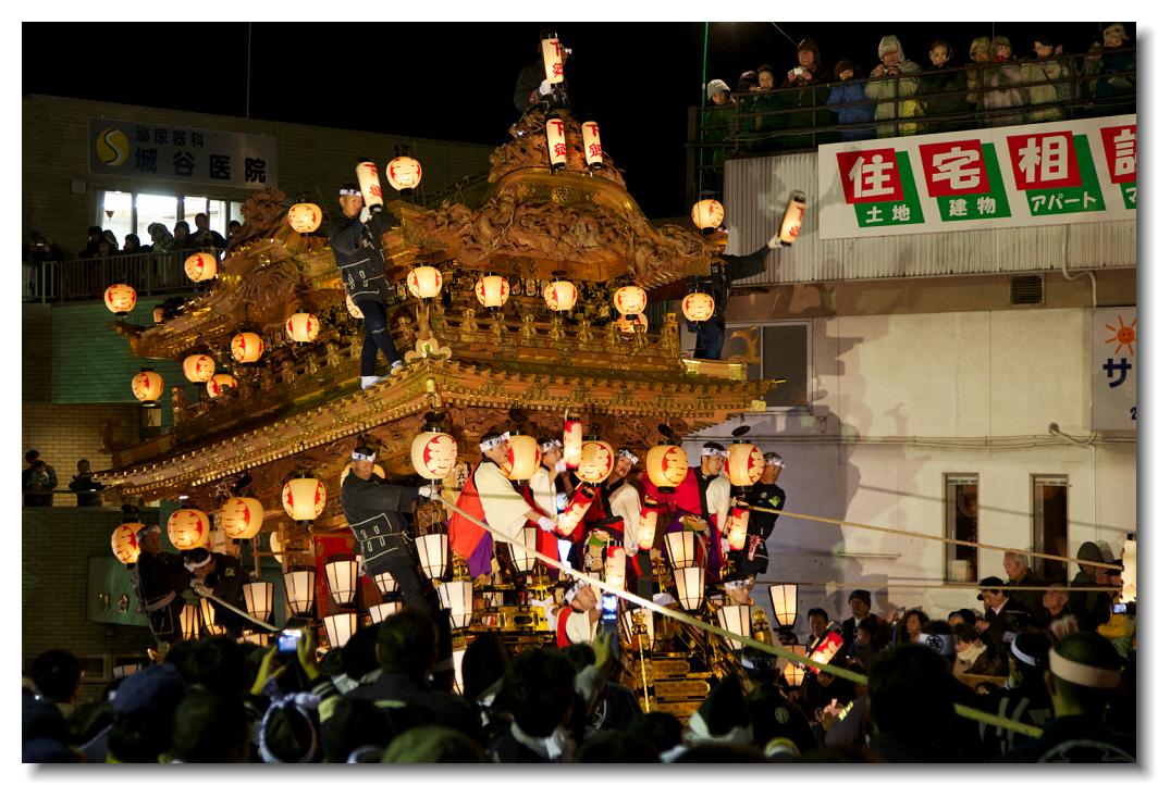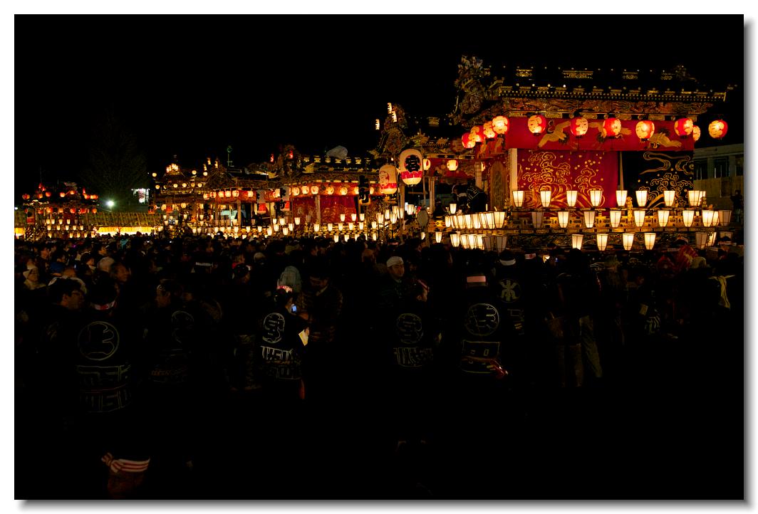 宵マチ EOS 5D Mark II 70〜200mm ※京都の祇園祭、飛騨高山祭と並び日本三大曳山祭、日本三大美祭の一つに数えられる秩父夜祭は秩父の名産品である絹の市がその始まりと言われています。江戸時代の享保年間(1716~36年)にはすでに祭が存在していたと言われています。当時秩父は江戸から見て西方に位置し、秩父札所巡りや秩父三社などの神仏巡りが盛んで、江戸の豪商たちの信仰も厚かったのでしょう。そのため、山里でありながらこれだけ豪華絢爛な山車が受け継がれてきたようです。本祭は12月3日ですが、12月2日は宵マチとして4基の屋台が曳行されます。左が本町、右が宮地の屋台です。秩父夜祭の山車は国の重要有形民俗文化財に指定されています。