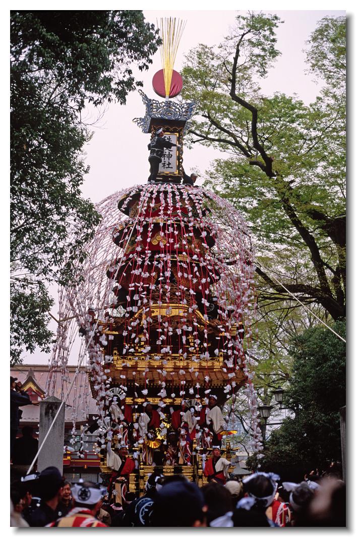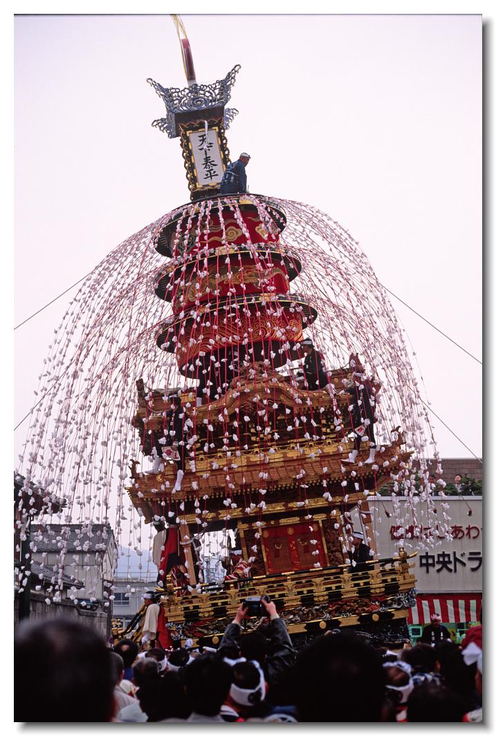 本祭 EOS 5D Mark II 70〜200mm ※3日は朝8時ころから山車の曳行が始まります。朝から沢山の人で賑わいます。宵マチでは曳行されない中近と下郷の2基の笠鉾も曳行されます。写真は細身で美しい中近笠鉾です。