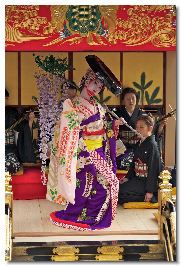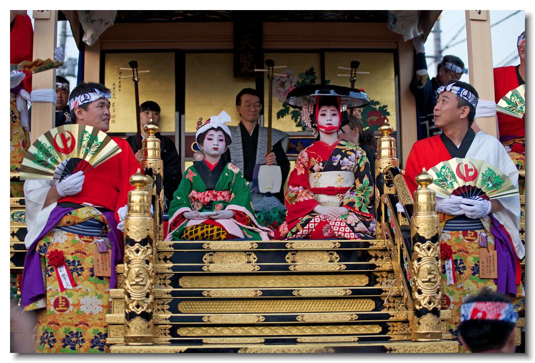 宵マチ EOS 5D 70〜200mm ※「曳き踊り」は文字通り屋台を曳行しながら街の所々で披露されます。曳行中舞妓さんは写真のように正座しています。上町屋台。