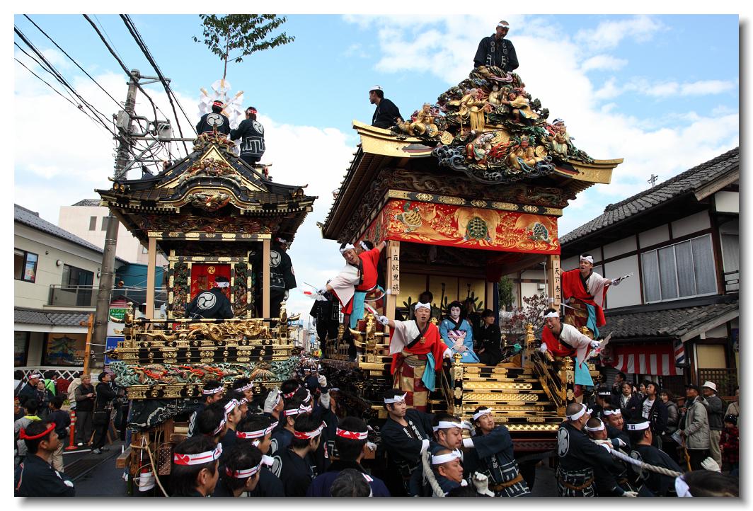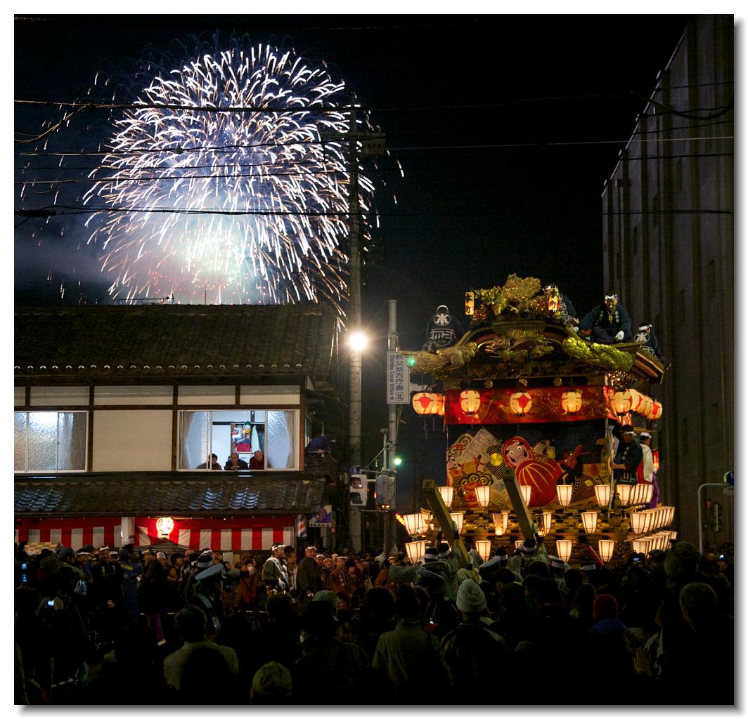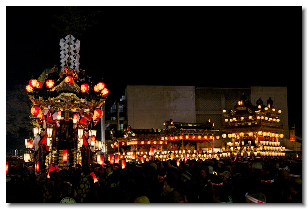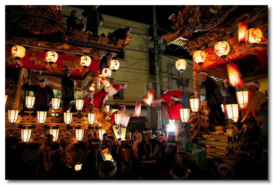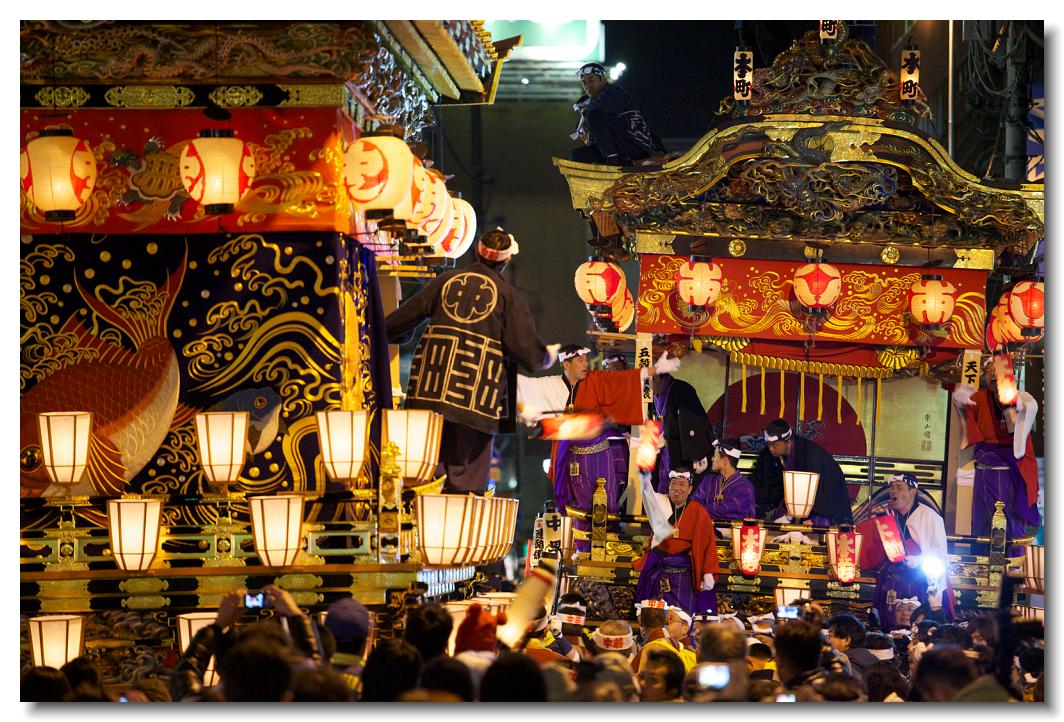 宵マチ EOS 5D Mark II 70〜200mm ※屋台のすれ違いは場所によっては屋根すれすれにすれ違っていきます。左が幼稚園児を乗せた中町屋台、2日ならではです。右が達磨が目印の本町屋台です。