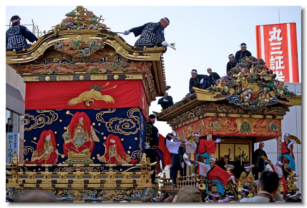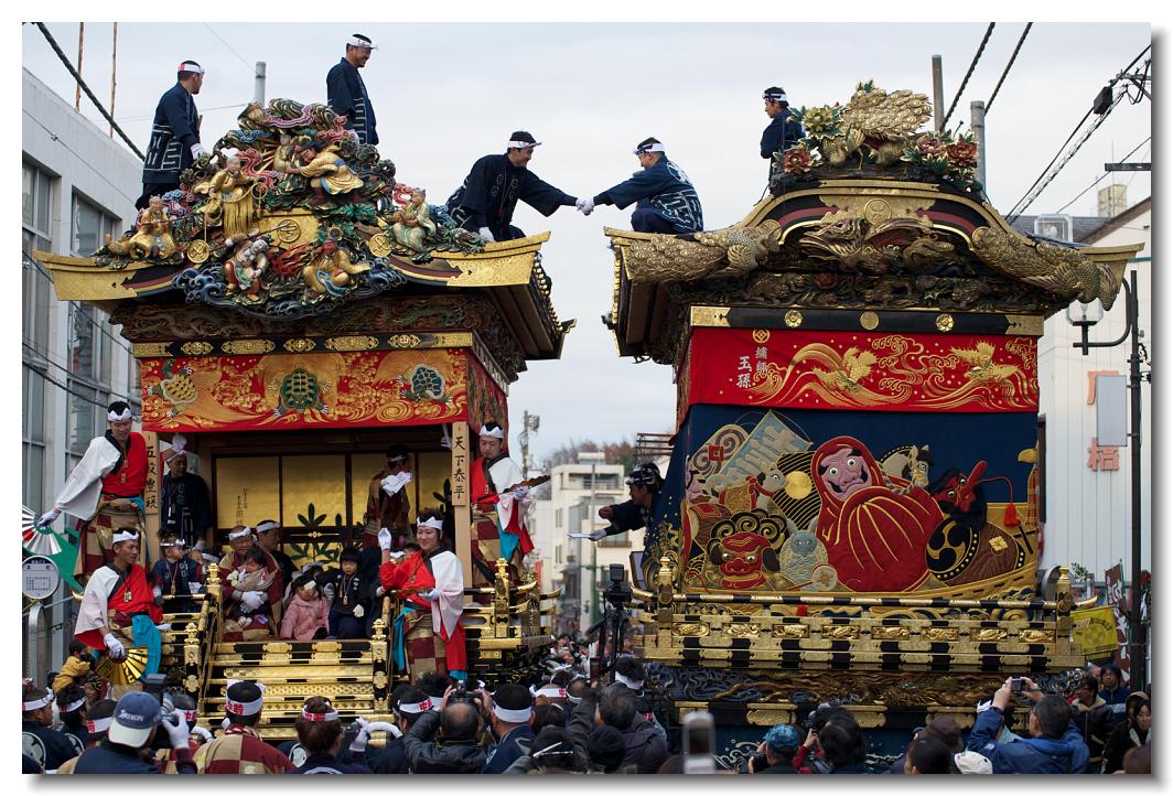 宵マチ EOS 5D 70〜200mm ※街中でのすれ違い。屋根の上の握手が印象的でありシャッターチャンスです。左が中町、右が本町屋台です。